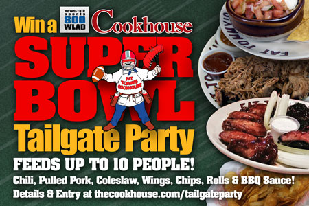 800 AM WLAD and Connecticut’s Number One Barbeque Restaurant, The Cookhouse in New Milford want to give you a Cookhouse Tailgate Party to bring home on Super Bowl Sunday! What a great way to treat family members and friends to a delicious Super Bowl feast! A Cookhouse Tailgate Party feeds up to 10 people and includes 2 quarts of Chili, four pounds of Pulled Pork, a quart of cole slaw, 2 orders of Cookhouse wings, a big bag of Cookhouse Home-made potato chips, and Sandwich rolls. And no football party would be complete without lots of Cookhouse Barbeque Sauce! Whether it’s the NFL play-offs or the Super Bowl, Cookhouse Catering does all the work…. and you can just sit back and enjoy the games! To enter for a chance to win the WLAD/ Cookhouse Super Bowl Tailgate Party, just go to the Cookhouse Facebook Page, “like” them and fill out the necessary details. WLAD contest rules apply and the winners' name will be announced Saturday January 24th at 9:36am on WLAD.